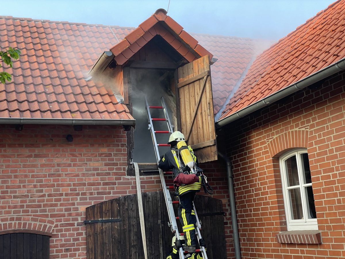 Da die Flammen auf weitere Gebäudeteile überzugreifen drohten, nahm ein Trupp auf der Rückseite des Gebäudes ein Strahlrohr vor, um das Feuer zu bekämpfen.