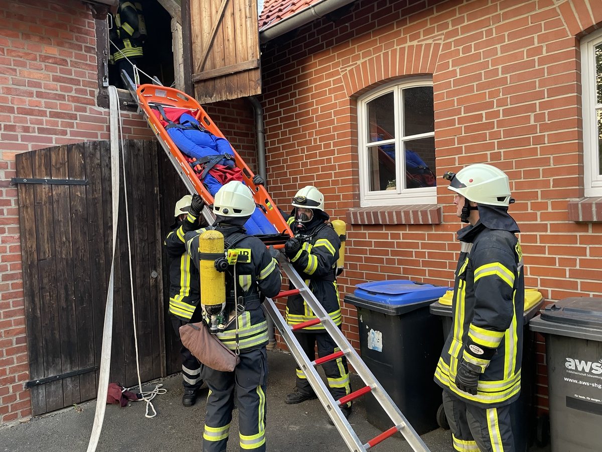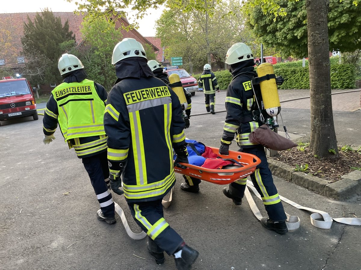 Im Gebäude fanden die Trupps die vermisste Person und leiteten eine Rettung ein. Da sie nicht mehr gehfähig war, musste sie über eine Schleifkorbtrage aus dem Gebäude gebracht werden.