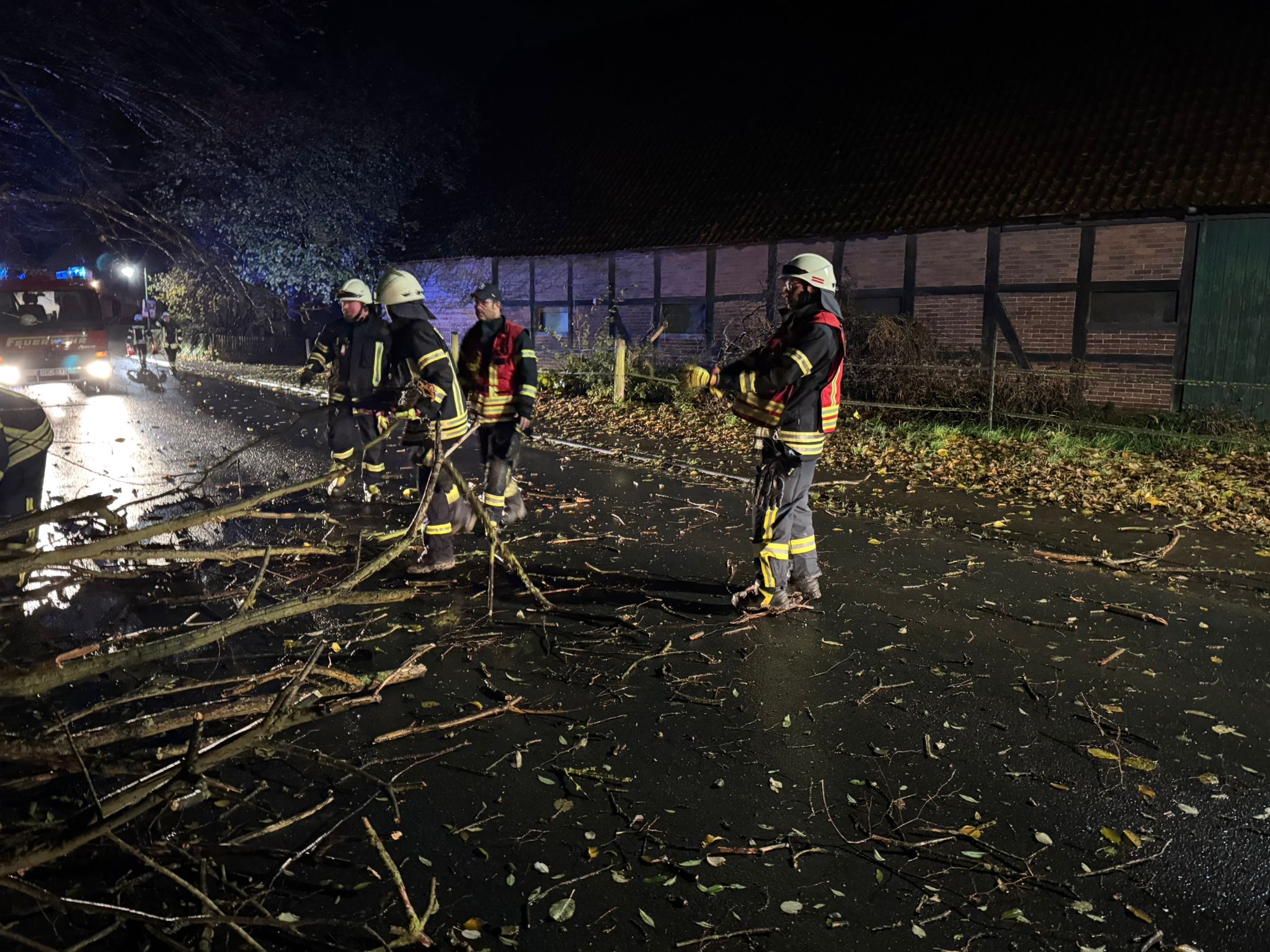 Ein Baum an der Ohndorfer Schulstraße hielt am 27.11.2024 den Böen von Sturm „Telse“ nicht stand und stürzte um. Seine Krone blockierte etwa die Hälfte der Straße. Wir wurden alarmiert, um das Hindernis zu beseitigen,.