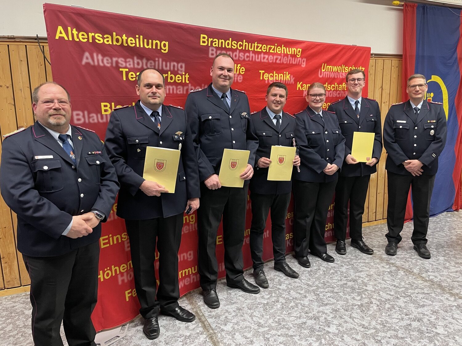 Laura Knorn und Leander Gießelmann erhielten vom Ortsbrandmeister Oliver Schwab die Ernennung zur Feuerwehrfrau, bzw. zum Feuerwehrmann. Der Gemeindebrandmeister beförderte schließlich Christian Haberstroh und Dennis Köpper zu Hauptlöschmeistern, sowie Philipp Daus zum Löschmeister.