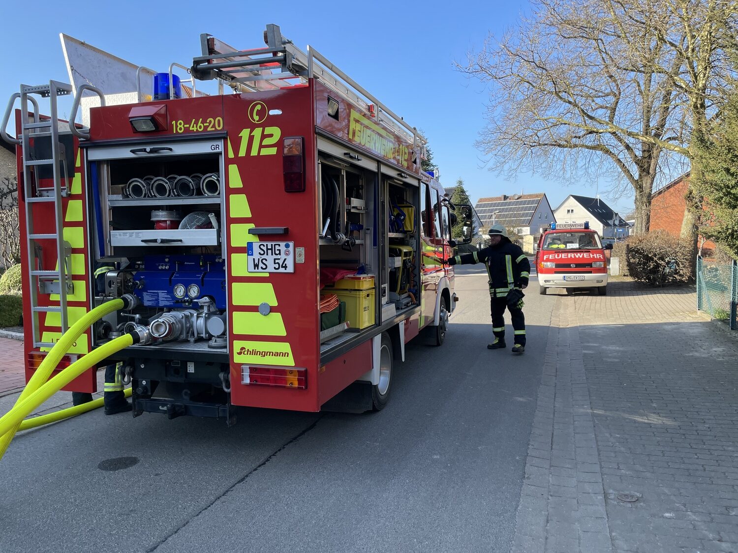 Wir begannen nach unserem Eintreffen umgehend mit dem Löschangriff. Ein Trupp unter Atemschutz löschte die Flammen ab und verhinderte somit die weitere Ausbreitung. Weitere Feuerwehrleute stellten derweil die Wasserversorgung aus einem Hydranten sicher.